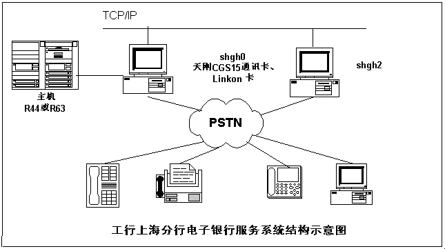 該系統(tǒng)以IBM提供的 R63和R44主機(jī)為中心,一臺Unix通信前置機(jī)通過CGS15通信卡與主機(jī)相連。該前置機(jī)與另一臺前置機(jī)連成局域網(wǎng),對外提供74線語音、傳真和MODEM服務(wù)。今后隨著業(yè)務(wù)的增長,可以通過增加通信前置機(jī)方式,增加對外服務(wù)線路,從而使系統(tǒng)具有良好的開放性和擴(kuò)展能力。
