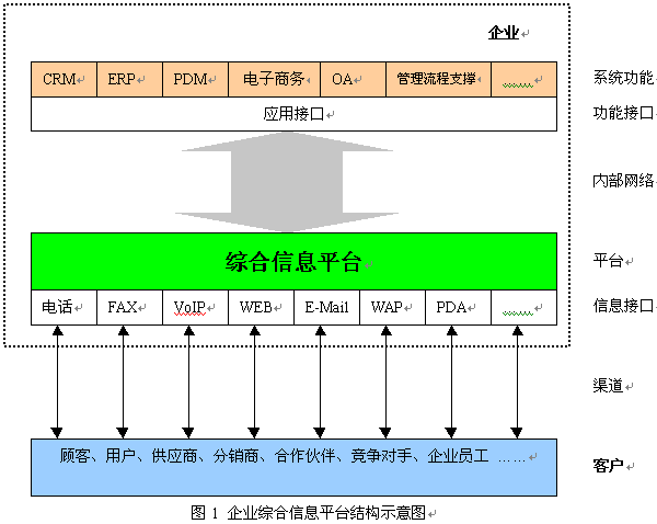 企業(yè)綜合信息平臺(tái)是一個(gè)完全從客戶(hù)出發(fā),并能更好地為客戶(hù)服務(wù)的一個(gè)平臺(tái)。這里我們所指的“客戶(hù)”是一個(gè)廣義的概念,綜合信息平臺(tái)的客戶(hù)不僅包括企業(yè)的客戶(hù)、用戶(hù),而且還包括企業(yè)內(nèi)部的員工、企業(yè)的供應(yīng)商、分銷(xiāo)商及合作伙伴,甚至還包括企業(yè)的競(jìng)爭(zhēng)對(duì)手。綜合信息平臺(tái),保證了企業(yè)內(nèi)部之間、企業(yè)與客戶(hù)之間的信息流得到暢通、高效的處理,可以高效、高質(zhì)量地為客戶(hù)服務(wù),提高客戶(hù)的滿(mǎn)意度和忠誠(chéng)度,同時(shí)使企業(yè)內(nèi)部的信息實(shí)現(xiàn)共享,并能支撐企業(yè)信息化各環(huán)節(jié)對(duì)客戶(hù)數(shù)據(jù)的依賴(lài),為企業(yè)信息化建設(shè)提供了一個(gè)開(kāi)放性的平臺(tái)。