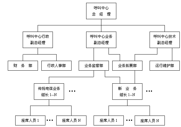 上圖是我們建議的呼叫中心組織結(jié)構(gòu)圖,其中業(yè)務(wù)監(jiān)督部門(mén)、業(yè)務(wù)拓展部門(mén)和運(yùn)行維護(hù)部門(mén)是呼叫中心最關(guān)鍵的部門(mén),財(cái)務(wù)部和行政人事部是三大核心部門(mén)的支撐部門(mén)。