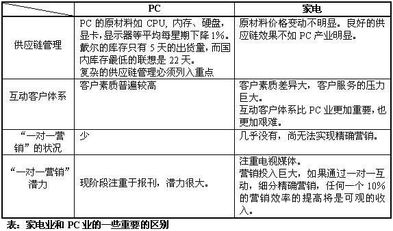 聯(lián)想長期構(gòu)筑的、在中國PC制造業(yè)的核心競爭力,正受到戴爾的巨大威脅,導(dǎo)致聯(lián)想開始轉(zhuǎn)而采用戴爾的按客戶需求定制、直接銷售的模式,希望建立新的核心競爭力,再度引領(lǐng)中國PC產(chǎn)業(yè)。IT制造業(yè)的巨變,戴爾的成功給陷于低層次競爭的家電產(chǎn)業(yè)很大的啟發(fā),曾經(jīng)鑄造中國家電企業(yè)輝煌的核心競爭力急需注入新的生命力,以適應(yīng)新的競爭形勢。計(jì)算機(jī)技術(shù)、互動通信技術(shù)的進(jìn)步以及互聯(lián)網(wǎng)的出現(xiàn)使企業(yè)能夠建立與用戶之間一對一的密切客戶關(guān)系,使服務(wù)創(chuàng)造價(jià)值,IT技術(shù)推動技術(shù)、產(chǎn)品、生產(chǎn)、銷售和營銷的發(fā)展,支撐家電企業(yè)建立新的核心競爭力。在同質(zhì)化競爭的環(huán)境下,家電企業(yè)也許更應(yīng)該從服務(wù)、營銷、銷售方面來建立自己的核心競爭力。海爾就是典型的例子,海爾的發(fā)展與它完善的服務(wù)體系和服務(wù)制度是分不開的。聚焦于服務(wù)、營銷、銷售的客戶關(guān)系管理(CRM)系統(tǒng)讓家電企業(yè)看到了新的希望?梢灶A(yù)言,CRM將為家電業(yè)點(diǎn)燃一盞新啟航燈。
