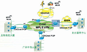 VPN中,實(shí)現(xiàn)業(yè)務(wù)在VLAN 和VPN中的無(wú)縫對(duì)接,以保證用戶數(shù)據(jù)的安全、高效傳輸;接入網(wǎng)采用基于RPR或SDH的MSPP環(huán)實(shí)現(xiàn)IP業(yè)務(wù)和TDM業(yè)務(wù)的綜合傳輸;在商業(yè)樓宇內(nèi)主要采用IAD設(shè)備將客戶的數(shù)據(jù)、語(yǔ)音、專線等業(yè)務(wù)接入CNC