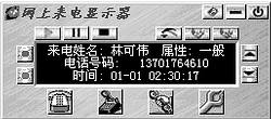 軟件簡介:主要解決用戶在撥號上網(wǎng)(不包括上網(wǎng)專線電話和部分虛擬小區(qū)用戶)的同時(shí)又不想錯(cuò)過來電的矛盾。在你上網(wǎng)時(shí)一旦有人打電話給你,您就可以通過Netcaller得知來電信息,還可給對方播放諸如“請稍候打過來,我馬上斷線”、“您的電話號碼我已知道,稍候我會(huì)打過來”、“請撥打另一個(gè)號碼xxx”,“請留言”等等語音提示。