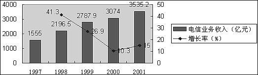 過(guò)去幾年是我國(guó)電信業(yè)大發(fā)展時(shí)期,電信收入平均每年增長(zhǎng)約23%。電話(huà)用戶(hù)總數(shù)與移動(dòng)電話(huà)總數(shù)迅速增長(zhǎng),并在2001年超過(guò)美國(guó),躍居世界第一。但是,過(guò)去的高增長(zhǎng)并不必然帶來(lái)明天的高增長(zhǎng),在2000年和2001年,我國(guó)電信收入已經(jīng)呈現(xiàn)出稍高于GDP的中速增長(zhǎng)態(tài)勢(shì)。