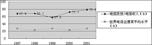 由于電信收入無(wú)法實(shí)現(xiàn)高增長(zhǎng),我國(guó)電信運(yùn)營(yíng)商如果繼續(xù)連續(xù)進(jìn)行大規(guī)模投資,將無(wú)法收回投資。我國(guó)電信運(yùn)營(yíng)業(yè)的投資一直保持在高水平,2000年度我國(guó)電信投資占到電信收入的72.3 %,而世界平均水平為21.9 %。在2001年度,我國(guó)電信投資/電信收入的比例高達(dá)78.6 %(依據(jù)CCID數(shù)據(jù)),這樣高的投資比例是不可能維持的。