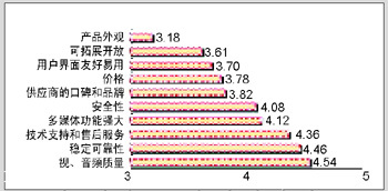 用戶重要性評價(jià)較高4≤Y<4.5的指標(biāo)主要有:穩(wěn)定可靠性、技術(shù)支持和售后服務(wù)、多媒體功能強(qiáng)大、安全性四項(xiàng)。由于視頻會議系統(tǒng)提供的是實(shí)時(shí)視音頻交互通訊,系統(tǒng)的任何不穩(wěn)定都會在圖像和聲音上表現(xiàn)出來,因此穩(wěn)定可靠性對視頻會議系統(tǒng)來說是至關(guān)重要的。