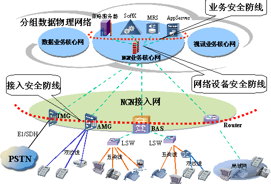NGN承載網(wǎng)采用的IP技術,與基于ATM和SDH的承載網(wǎng)相比,其開放性特點非常適合網(wǎng)絡業(yè)務的發(fā)展,但IP協(xié)議的開放性和公用性,也使NGN網(wǎng)絡不可避免地受到黑客或病毒程序的攻擊或干擾,面臨如用戶仿冒、盜打、破壞服務、搶占資源等安全問題。 NGN業(yè)務網(wǎng)與數(shù)據(jù)業(yè)務網(wǎng)二層隔離,形成一個相對封閉的業(yè)務網(wǎng)。應對所有進行NGN業(yè)務網(wǎng)的每一個入口進行嚴格的安全控制。