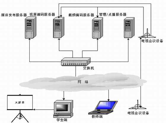 當(dāng)老師端在異地時(shí)(攝像頭離服務(wù)器較遠(yuǎn),無法物理連接),可通過“電視會(huì)議系統(tǒng)”將老師的圖像及聲音實(shí)時(shí)傳送到編碼服務(wù)器,桌面課件可以通過PcAnywhere傳送到編碼服務(wù)器。圖像,聲音和桌面課件通過Web Streaming采集壓縮并在網(wǎng)上實(shí)時(shí)廣播。這種系統(tǒng)架構(gòu)也是當(dāng)今功能比較齊全和完善的一種實(shí)現(xiàn)方式。