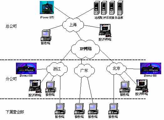 某證券公司有三級(jí)網(wǎng)絡(luò),總公司、分公司和下屬營業(yè)部。總公司到分公司帶寬是2M,在總公司配置一套會(huì)議室型電視會(huì)議終端POLYCOM 970和一套多點(diǎn)會(huì)議服務(wù)器Radvision ViaIP400。在分公司配置了38套會(huì)議室型電視會(huì)議終端POLYCOM 680,用于與總公司進(jìn)行雙向視頻會(huì)議。分公司到營業(yè)部帶寬是512K,各營業(yè)部安裝遠(yuǎn)程股評系統(tǒng)接收端程序,遠(yuǎn)程股評系統(tǒng)服務(wù)器都放置在海通總公司。當(dāng)在總公司進(jìn)行股評時(shí),總公司本地?cái)z像頭拍攝教師畫面,MIC采集教師聲音,傳給服務(wù)器編碼,再通過網(wǎng)絡(luò)供各個(gè)接收端接收;當(dāng)在分公司進(jìn)行股評時(shí),首先分公司的電視會(huì)議設(shè)備采集教師畫面及聲音傳回總公司的電視會(huì)議設(shè)備,再傳給遠(yuǎn)程股評系統(tǒng)的服務(wù)器進(jìn)行編碼,然后通過網(wǎng)絡(luò)發(fā)布,供接收端接收。(結(jié)構(gòu)如下圖)