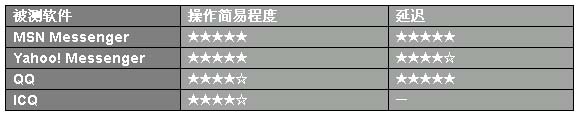 MSN Messenger和Yahoo! Messenger的操作都很簡單,只是MSN Messenger在同樣的畫質下延遲要小于Yahoo! Messenger,表現出更優(yōu)的實用性。QQ操作也不算太復雜,只是會員和非會員在功能上有一些限制,不過在同畫質的延遲方面做的算是出色,ICQ操作沒有測試成功。
