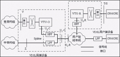 VTU-R分別是位于局端和用戶(hù)端的VDSL收發(fā)器。業(yè)務(wù)分離器(Splitter,包括HPF和LPF)將同一對(duì)電話銅纜上傳輸?shù)腣DSL與窄帶業(yè)務(wù)(或ADSL)