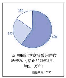 彩鈴業(yè)務最先是由韓國的SK電信于2002年3月推出的,業(yè)務一經(jīng)面世就吸引了移動用戶、特別是年青用戶群體的眼球,開通的用戶數(shù)和業(yè)務使用率呈指數(shù)式增長;同時由彩鈴業(yè)務帶來的互聯(lián)網(wǎng)、WAP和IVR的話務量的增長進一步提升了彩鈴業(yè)務的含金量。隨后韓國的其他兩個移動運營商LG電信和韓國電信也分別于2002年6月和9月相繼開通彩鈴業(yè)務。經(jīng)過運營商和彩鈴的內容提供商的前期市場推廣和運作,目前已發(fā)展了近1000萬用戶,其中運營商的市場份額如圖所示。