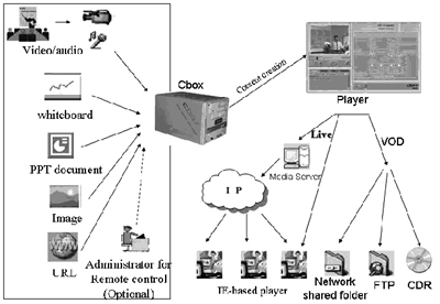 在對市場上現(xiàn)有產(chǎn)品進行了綜合比較后,上海市稅務(wù)局決定使用美國Winnov公司的Cbox系統(tǒng)。Cbox是一種視頻采集和控制系統(tǒng),可以支持多種格式文檔,通過URL方式可以提供對未來文檔格式的支持,在操作時只需將文檔提供給Cbox,其余工作由Cbox自動完成; 自動攝像頭控制可預(yù)設(shè)三個位置,Cbox自動感應(yīng),并支持助教、直播、點播等模式,同時具有多種分發(fā)方式,可以存在局域網(wǎng)共享目錄、自動上傳至FTP和刻錄光盤。