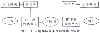IP中繼媒體網(wǎng)關(guān)在IP網(wǎng)絡(luò)和電路交換網(wǎng)絡(luò)(SCN)之間提供媒體映射和代碼轉(zhuǎn)換功能,即終止電路交換網(wǎng)絡(luò)設(shè)施(中繼線路),將媒體流分組化并在IP網(wǎng)絡(luò)上傳輸,在IP網(wǎng)絡(luò)去往SCN的方向也執(zhí)行類似的功能。IP中繼媒體網(wǎng)關(guān)在網(wǎng)絡(luò)中的位置如圖1所示。