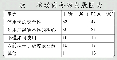 手機(jī)支付業(yè)務(wù)的進(jìn)一步發(fā)展主要受制于用戶對該項(xiàng)業(yè)務(wù)的接受程度。Forrester研究公司的研究表明,超過一半的被訪者認(rèn)為信用卡的安全性是移動(dòng)商務(wù)發(fā)展的主要阻力。(調(diào)查結(jié)果見下表)