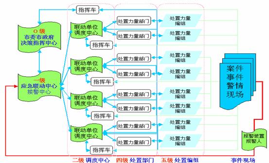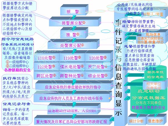 根據(jù)接過(guò)來(lái)的警情,應(yīng)急聯(lián)動(dòng)系統(tǒng)向處置力量部門(mén)發(fā)出指令派出處置力量編組到現(xiàn)場(chǎng),并根據(jù)現(xiàn)場(chǎng)反饋回來(lái)的信息,決定是否增援或歸隊(duì)。事件記錄通過(guò)局域網(wǎng)被送到相應(yīng)的處警員終端,處警員通過(guò)計(jì)算機(jī)輔助調(diào)度系統(tǒng)查詢(xún)相關(guān)資料,制定反應(yīng)措施,并向相關(guān)聯(lián)動(dòng)單位發(fā)出具體調(diào)度指令。在緊急事件發(fā)生時(shí),相應(yīng)的電子預(yù)案會(huì)被觸發(fā)啟動(dòng)。如果發(fā)生了重大災(zāi)難,險(xiǎn)情或特殊的事件,則可以啟用城市緊急狀態(tài)指揮室,由首長(zhǎng)進(jìn)行統(tǒng)一指揮。