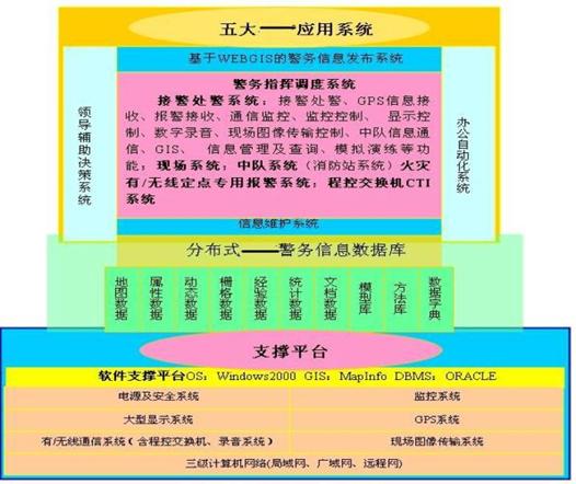 支撐平臺(tái)有計(jì)算機(jī)網(wǎng)絡(luò)系統(tǒng)、監(jiān)控系統(tǒng)、顯示系統(tǒng)、GPS系統(tǒng)、有/無(wú)線(xiàn)通信系統(tǒng)、圖像傳輸系統(tǒng)、電源及機(jī)房、軟件支撐平臺(tái)等。其中,計(jì)算機(jī)網(wǎng)絡(luò)系統(tǒng)包括指揮中心、二級(jí)指揮中心與移動(dòng)指揮中心、業(yè)務(wù)執(zhí)行機(jī)構(gòu)(如:應(yīng)急中隊(duì)、派出所等)之間的三級(jí)計(jì)算機(jī)網(wǎng)絡(luò),即指揮中心局域網(wǎng)絡(luò)、業(yè)務(wù)機(jī)關(guān)網(wǎng)絡(luò)、與分支機(jī)關(guān)的廣域網(wǎng)絡(luò)、與移動(dòng)指揮中心的遠(yuǎn)程訪(fǎng)問(wèn)網(wǎng)絡(luò)。指揮中心與二級(jí)指揮中心、分支機(jī)構(gòu)、移動(dòng)中心之間有語(yǔ)音通信、數(shù)據(jù)通信,指揮中心與移動(dòng)中心有語(yǔ)音通信、數(shù)據(jù)通信(無(wú)線(xiàn))、現(xiàn)場(chǎng)圖像傳輸;指揮中心與公安其它機(jī)構(gòu)通過(guò)撥號(hào)網(wǎng)絡(luò)訪(fǎng)問(wèn)(內(nèi)網(wǎng)),指揮中心與普通老百姓通過(guò)撥號(hào)網(wǎng)絡(luò)訪(fǎng)問(wèn)(外網(wǎng))。