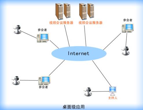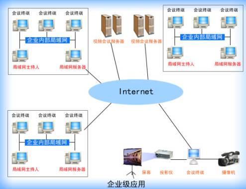 在企業(yè)級別的應(yīng)用中,企業(yè)將服務(wù)器構(gòu)架在公司內(nèi)部,遠(yuǎn)程用戶及局域網(wǎng)內(nèi)部的用戶均可登錄服務(wù)器,實現(xiàn)交互。企業(yè)級視頻會議系統(tǒng)的應(yīng)用實際上就是將桌面級視頻會議與會議室級視頻會議系統(tǒng)有機的結(jié)合在一起,客戶端硬件外設(shè)可以按照以上的建議,根據(jù)各終端不同的需求進(jìn)行配置。