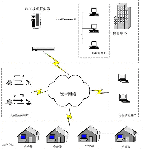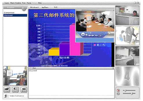 計算機、網(wǎng)絡技術(shù)高速發(fā)展的今天,傳統(tǒng)的通訊方式日益滿足不了人們的要求。人們要求能進行遠程會議,開展面對面的交流;同時,在滿足傳統(tǒng)視頻會議音/視頻通信的基本要求之外,現(xiàn)代會議更希望能夠提供更加豐富多樣的會議討論形式和功能,比如:遠程開展季度/年度預算及工作計劃的討論,需要遠程共享PPT等演示文檔和EXCEL等表格,需要共同就某一網(wǎng)上信息開展討論,甚至能夠?qū)㈤_會的通知通過電子郵件和手機短消息的方式傳達到每一個與會者那里。
