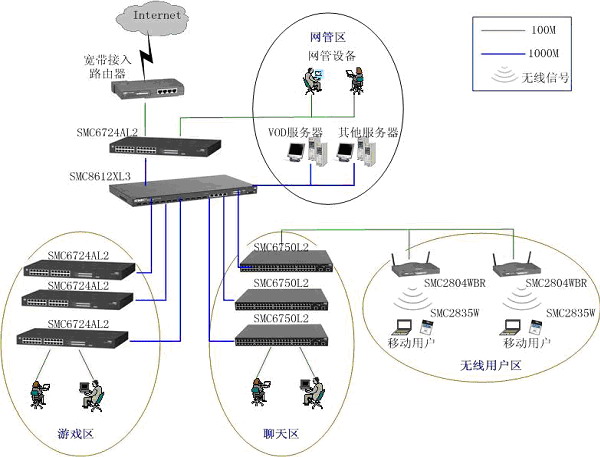 本方案采用"千兆光纖干線,百兆交換到桌面"的設(shè)計(jì)思路,各骨干線路均為1000M。骨干網(wǎng)通過高速線路接入INTERNET,網(wǎng)吧內(nèi)實(shí)現(xiàn)主干千兆交換、百兆到點(diǎn),整個(gè)網(wǎng)吧內(nèi)實(shí)現(xiàn)無(wú)阻塞通信。根據(jù)顧客的不同消費(fèi)需求,將網(wǎng)吧分為了網(wǎng)絡(luò)游戲區(qū)、聊天區(qū)、貴賓區(qū)等,根據(jù)不同區(qū)域的特點(diǎn),細(xì)化了不同網(wǎng)絡(luò)的解決方案。方案中采用的核心設(shè)備和二層設(shè)備都支持802.1Q標(biāo)準(zhǔn)VLAN和IGMP組播協(xié)議,為VOD、多媒體娛樂等豐富應(yīng)用的開展打下了堅(jiān)實(shí)的基礎(chǔ) 。通過劃分VLAN,MAC地址綁定來劃分了不同類型用戶,很好地滿足網(wǎng)吧的各項(xiàng)業(yè)務(wù)應(yīng)用需求。此外,SMC的豐富無(wú)線網(wǎng)絡(luò)產(chǎn)品可以很靈活的滿足網(wǎng)吧的組網(wǎng)需求,投資少、施工快。在提供高性能的同時(shí),還保證很好的安全性,既支持基于802.11b標(biāo)準(zhǔn)的安全機(jī)制,又支持動(dòng)態(tài)安全鏈路,以及基于802.1x的增強(qiáng)性安全或認(rèn)證功能。