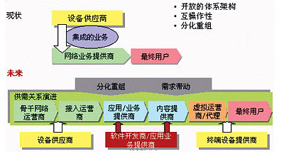 隨著市場(chǎng)對(duì)業(yè)務(wù)的需求越來越高,運(yùn)營(yíng)商扮演業(yè)務(wù)開發(fā)者和業(yè)務(wù)提供者角色將不再能夠滿足需求,新業(yè)務(wù)的提供速度與業(yè)務(wù)的種類都逐步處于劣勢(shì),這時(shí)運(yùn)營(yíng)商需要放棄原來屬于自己的利益,從全業(yè)務(wù)提供商逐步演變?yōu)榫W(wǎng)絡(luò)提供商和網(wǎng)絡(luò)業(yè)務(wù)集成商。例如,通過與ICP/ISP的合作,構(gòu)造NGN業(yè)務(wù)價(jià)值鏈,提供包括網(wǎng)絡(luò)教育、網(wǎng)絡(luò)證券等寬帶增值服務(wù);通過開放的Parlay