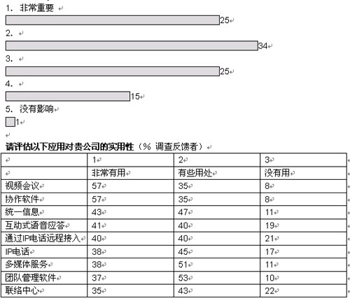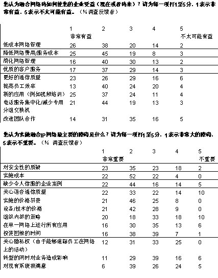 我們調(diào)查的企業(yè)中,有超過三分之二將在未來五年內(nèi)實(shí)現(xiàn)大多數(shù)或者所有部門向融合網(wǎng)絡(luò)的轉(zhuǎn)型。大部分企業(yè)采取按部就班的形式在某些特殊部門和業(yè)務(wù)開始部署。在融合應(yīng)用中,IP語音電話將在未來三年內(nèi)吸引大量投資;管理人士期望通過大幅削減公司內(nèi)部的通話費(fèi)用獲得早期的回報。在更廣泛的層面上,大多數(shù)管理者預(yù)計,融合網(wǎng)絡(luò)對其企業(yè)的商業(yè)影響將會“非常重要”或者“重要”。
