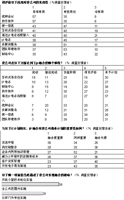融合網(wǎng)絡(luò)已經(jīng)成為現(xiàn)實(shí)。在經(jīng)濟(jì)學(xué)家信息部展開的全球調(diào)查中,103位高級經(jīng)理中超過半數(shù)的人投票表示,他們的企業(yè)已經(jīng)開始實(shí)施IP網(wǎng)絡(luò)融合,還有26%表示他們將計劃部署。