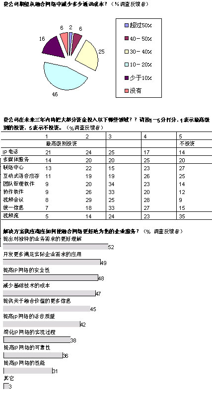 盡管如此,雖然IP融合的真正長期效益可能有利于提高員工效率,但是投資必須得到公司首席財務(wù)官的認(rèn)可。在總體網(wǎng)絡(luò)成本中預(yù)計可以節(jié)約多少?大多數(shù)公司希望削減10%-20%的費(fèi)用,也有相當(dāng)一部分公司期望減少30%-40%的費(fèi)用。上述報告中提到的實(shí)例中表明,這樣的節(jié)約是可以實(shí)現(xiàn)的。