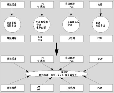 典型的大企業(yè),其電話會議,視頻會議以及網(wǎng)絡(luò)與數(shù)據(jù)會議通常是相互獨立的系統(tǒng)。UCC可以實現(xiàn)各種通信平臺的協(xié)同工作,員工只需使用一個通用界面便可調(diào)用多種終端設(shè)備。它將視頻會議、音頻會議、短消息以及網(wǎng)絡(luò)接入結(jié)合在一起。還能結(jié)合IP電話功能,如狀態(tài)信息功能等。本專題專門介紹了業(yè)界較為成功的幾種融合視頻概念和產(chǎn)品。
