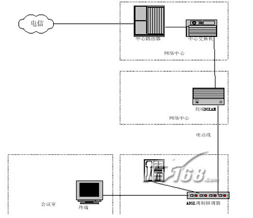 通過V.35接口接入到用戶網(wǎng)絡(luò)中的路由器上,電信網(wǎng)絡(luò)中心的MODEM則通過V.35接口接入到電信網(wǎng)絡(luò)的路由器上,連接速率從64Kbps-2Mbps可選,可以滿足視頻會議的接入要求。
