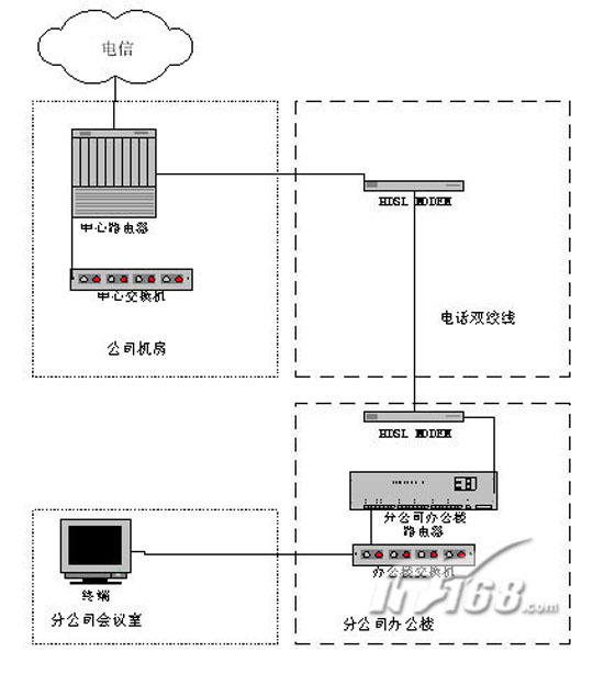 MODEM,就可以實現(xiàn)用戶到電信骨干網(wǎng)的網(wǎng)絡(luò)接入。網(wǎng)絡(luò)中心機房的HDSL MODEM通過V.35線纜直接接入到網(wǎng)絡(luò)中心的路由器上,用戶的HDSL