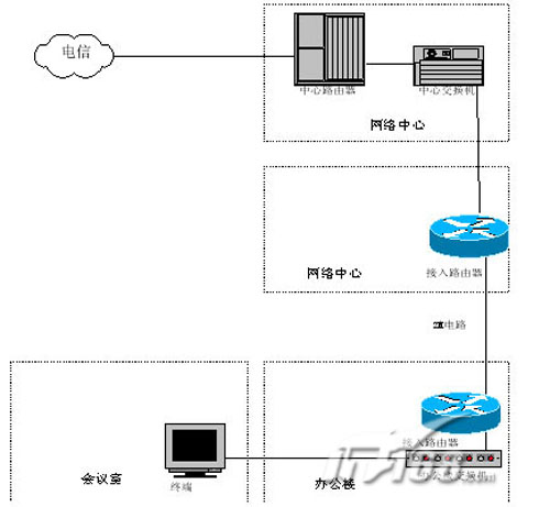 。。光纖接入也是一種方便的接入方案。在電信機房與用戶之間直接鋪設(shè)光纖或者租借第三方的光纖,在兩端增加一對光電轉(zhuǎn)換器,電信機房的光纖轉(zhuǎn)換器連接到中心交換機上,直接接入電信骨干網(wǎng),用戶端的光電轉(zhuǎn)換器連接到本地的局域網(wǎng)的交換機上,這樣可以實現(xiàn)本地的視頻會議終端的接入。