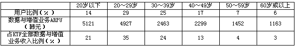 與競(jìng)爭(zhēng)對(duì)手SKT一樣,KTF針對(duì)不同年齡段的用戶(hù)建立了個(gè)性化的獨(dú)立服務(wù)品牌,這些服務(wù)品牌分別是BiGi(主要針對(duì)13~18歲的未成年人)、Na(主要針對(duì)18~25歲的青年學(xué)生)、Main(針對(duì)25~35歲的男性用戶(hù))、Hyo(針對(duì)35歲以上用戶(hù))以及DRAMA(針對(duì)所有年齡的女性用戶(hù))。從各年齡用戶(hù)群的業(yè)務(wù)使用情況看,占總用戶(hù)43%的30歲以下年輕用戶(hù)是KTF最主要的數(shù)據(jù)與增值業(yè)務(wù)消費(fèi)群體。見(jiàn)表4。