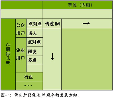 IT行業(yè)發(fā)展數十年,有一個共識,或是一種經驗結論,大約是:在用“老工具解決新問題”、“老工具解決老問題”、“新工具解決老問題”、“新工具解決新問題”四者中,一般最先者最善,也極討巧,最后者則最為事倍功半。觀IM發(fā)展趨勢,似乎介于“新工具解決老問題”、“新工具解決新問題”二者之間,就體現在表中兩個箭頭上,是以錢景堪憂。