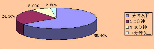 從圖1可知,電話用戶在本地通話中,通話時長在1分鐘以下的占65.4%,1~3分鐘的占24.1%,兩者相加占總通話次數(shù)的89.5%。如果以通話時長3分鐘為是否使用“彩話”業(yè)務(wù)的判斷點,那么電話用戶通話次數(shù)中僅有10.5%需要設(shè)置“彩話”業(yè)務(wù),這與“彩鈴”用戶在100%的通話次數(shù)中采用“彩鈴”業(yè)務(wù)有相當大的差距。