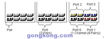 Fabric 接口的最小連接單元。端口的兩對(duì)差分信號(hào)被映像成一收一發(fā)的傳輸模式。下圖描繪了一個(gè)差分對(duì)、一個(gè)端口、以及一個(gè)通路的針腳分布。