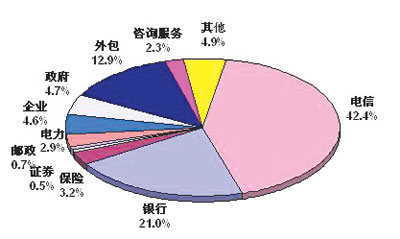 2004年中國(guó)呼叫中心席位總數(shù)為14萬(wàn)個(gè),從不同行業(yè)呼叫中心席位數(shù)量看,電信行業(yè)占據(jù)60%以上的市場(chǎng)份額,制造企業(yè)占6.5%,政府占5.65%,銀行占5.58%。2004年中國(guó)呼叫中心投入205.0億元,從不同行業(yè)呼叫中心投入絕對(duì)值看,電信行業(yè)占據(jù)42.4%,銀行占21.0%,外包占12.9%,其他行業(yè)市場(chǎng)份額均低于5.0%。