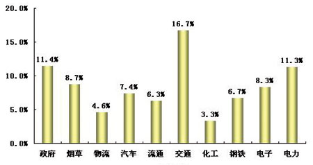 2005年中國(guó)主要行業(yè)的大型用戶呼叫中心需求比例平均為8.5%。其中需求比例較高的行業(yè)有交通、政府、電力,這些行業(yè)大型用戶呼叫中心需求比例超過(guò)了10%。另外,煙草、汽車(chē)制造、流通和鋼鐵企業(yè)呼叫中心需求大致在7%~8%左右。物流行業(yè)和化工企業(yè)需求比例較低。