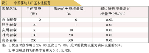 1X的優(yōu)勢是技術(shù)先進(jìn),速度快,但部分地區(qū)網(wǎng)絡(luò)覆蓋不足,開通國際漫游數(shù)據(jù)業(yè)務(wù)的國家少。此外,在收費(fèi)上雙方也有不同。表2是中國移動與中國聯(lián)通WAP基本通信費(fèi)比較(各省之間略有不同)。