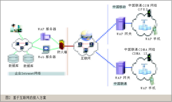 企業(yè)應(yīng)用系統(tǒng)要支持WAP應(yīng)用必須與中國移動和中國聯(lián)通的移動網(wǎng)絡(luò)建立連接。根據(jù)應(yīng)用的安全性要求和數(shù)據(jù)流量,有以下兩種接入方案可供選擇。