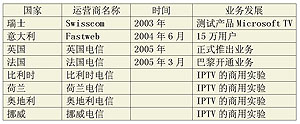 歐洲電信運(yùn)營(yíng)商在部署IPTV時(shí),主要采用三重服務(wù)(triple-play)業(yè)務(wù)模式占領(lǐng)市場(chǎng)。該業(yè)務(wù)模式有助于電信運(yùn)營(yíng)商與有線電視運(yùn)營(yíng)商的競(jìng)爭(zhēng)。目前,歐洲電信運(yùn)營(yíng)商已準(zhǔn)備或開始IPTV的商業(yè)化進(jìn)程。