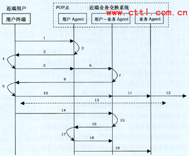 在POP點處,每類業(yè)務(wù)有一個“業(yè)務(wù)Agent”,其生命周期與運營商此類業(yè)務(wù)的生命周期相同,即從運營商開通此類業(yè)務(wù)到運營商終止提供此類業(yè)務(wù)為止,因此“業(yè)務(wù)Agent”基本上是長期存在的。“業(yè)務(wù)Agent”負責(zé)對不同用戶的同類業(yè)務(wù)進行匯聚,統(tǒng)一與遠端的“業(yè)務(wù)Agent”進行業(yè)務(wù)交互。
