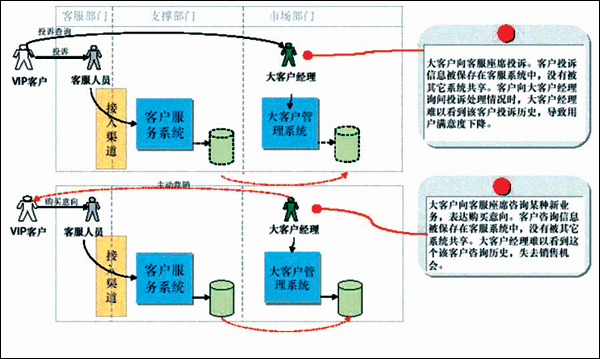 投訴的后臺處理流程分布在BOSS系統(tǒng)、1860客服中心、DSMP數(shù)據(jù)業(yè)務(wù)管理平臺以及OA多個業(yè)務(wù)支撐系統(tǒng)之中,系統(tǒng)之間相對獨(dú)立,同時投訴的交互數(shù)據(jù)分散在各個系統(tǒng)內(nèi),沒有一個完整、統(tǒng)一的客戶投訴資料,從而無法在不同的服務(wù)渠道中取得完整的客戶投訴信息,影響了客戶服務(wù)的質(zhì)量。當(dāng)公司管理層需要了解某一項活動的開展情況或近期的投訴熱點(diǎn)、焦點(diǎn)問題時,操作人員只能采用傳真方式,臨時要求全省17地市、公司在一定時間內(nèi)上報,匯總后研究分析再行提交,使投訴熱點(diǎn)或焦點(diǎn)問題不能及時反饋給管理層。信息嚴(yán)重滯后,更談不上針對客戶投訴咨詢熱點(diǎn)問題進(jìn)行數(shù)據(jù)挖掘,推出針對性的營銷策略。