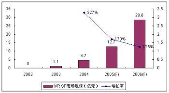 由于運營商的監(jiān)管和增量市場需求的減少,2005年IVR高速增長的勢頭有所回落,市場增長速度趨于理性,SP市場份額增長率為170%,整體SP市場份額達到12.7億元。諾盛預計2006年IVR市場增長率將繼續(xù)回調(diào),但絕對增長率仍然較快,達到125%。