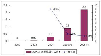 作為SP和移動運營商都非?春玫臉I(yè)務(wù),JAVA業(yè)務(wù)受到眾多SP的青睞。盡管作為JAVA主要業(yè)務(wù)的手機游戲目前盈利狀況普遍欠佳,但空中網(wǎng)、美通無線、數(shù)字魚等SP仍然大量投入,期待著未來業(yè)務(wù)的高速增長。受制于終端和JAVA游戲的表現(xiàn)力,2005年JAVA業(yè)務(wù)的SP市場規(guī)模增長率回落到200%,諾盛預計2006年JAVA的使用環(huán)境沒有太大變化,其增長率進一步回落至144%。