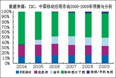 與彩鈴服務(wù)相比,圖片下載、彩信業(yè)務(wù)由于受到手機(jī)價(jià)格等因素的影響,近兩年的推廣不是很順利。IDC中國電信研究部經(jīng)理級分析師王彥認(rèn)為,隨著彩屏手機(jī)終端的體積和價(jià)格都有所下降,彩信業(yè)務(wù)在今后兩年將呈現(xiàn)一個(gè)較好的發(fā)展趨勢,IDC預(yù)測該業(yè)務(wù)的未來五年CAGR將達(dá)到12.5%。