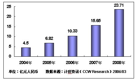Research)數(shù)據(jù)表明,2005年,我國移動(dòng)政務(wù)市場規(guī)模達(dá)6.82億元,增長率為51.6%,預(yù)計(jì)2006年,我國移動(dòng)政務(wù)市場規(guī)模將達(dá)到10.33億元,預(yù)計(jì)未來三年內(nèi),中國移動(dòng)政務(wù)復(fù)合增長率將達(dá)到51.5%,截至2008年,我國移動(dòng)政務(wù)市場規(guī)模將突破20億元。
