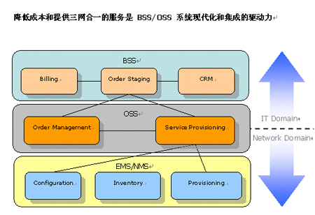 我們可以看到,集成現(xiàn)存的OSS/BSS即 NMS/EMS 是 三網(wǎng)合一的必然要求。 然而傳統(tǒng)的EAI和BPM集成產(chǎn)品是被設計成滿足IT部門集成CRM或ERP等應用的需要,很少被用于OSS層面,原因很簡單:BSS中的系統(tǒng)多半是單一廠商提供的,只和BSS中的特定應用打交道。然而,