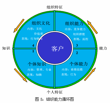 組織能力循環(huán)圖說明,管理者不僅要關(guān)注對組織中個體層次特性的管理,如個體知識、個體能力,更要關(guān)注組織層次特性的管理,如組織能力和企業(yè)文化。只有管理者將目光由個體能力轉(zhuǎn)向組織能力時,即更注重組織層次的能力建設時,組織才會真正地成長和發(fā)展。