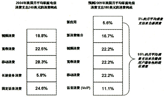 作為可以提供整合平臺(tái)的服務(wù),IMS在消費(fèi)者和企業(yè)應(yīng)用上都會(huì)為運(yùn)營(yíng)商帶來(lái)收入的增長(zhǎng)。首先分析IMS可能為消費(fèi)者帶來(lái)的收入增長(zhǎng)。比較美國(guó)2004年和2009年預(yù)計(jì)的電信消費(fèi)支出構(gòu)成。2009年,95%的消費(fèi)支出仍然是既有的業(yè)務(wù),運(yùn)營(yíng)商通過(guò)提供業(yè)務(wù)包和服務(wù)包捆綁既有用戶群。5%的新消費(fèi)支出是IMS新應(yīng)用的主戰(zhàn)場(chǎng)。