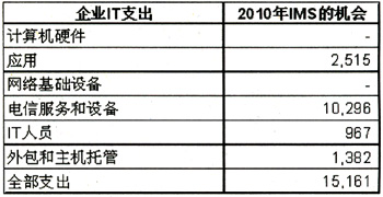 在企業(yè)市場(chǎng),運(yùn)營(yíng)商將獲得重要的收入機(jī)會(huì)。IMS是運(yùn)營(yíng)商從網(wǎng)絡(luò)級(jí)IT應(yīng)用、主機(jī)數(shù)據(jù)中心服務(wù)和專(zhuān)業(yè)服務(wù)上獲得收入的希望。到2010年IMS有機(jī)會(huì)為美國(guó)運(yùn)營(yíng)商產(chǎn)生超過(guò)150億美元的年收入。雖然不能完全保證這個(gè)規(guī)模的收入貢獻(xiàn),但是任何運(yùn)營(yíng)商都不會(huì)輕易錯(cuò)過(guò)這個(gè)巨大的潛在市場(chǎng)機(jī)會(huì)。
